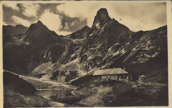 Schronisko przy Zielonym Stawie w Dolinie Kieżmarskiej. W tle Czarny Szczyt, Kołowy Szczyt i Jastrzębia Turnia.