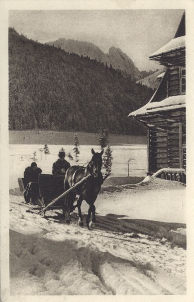 Na pierwszym planie sanie. Po prawej stronie fragment budynku. W tle widać ośnieżony Giewont.