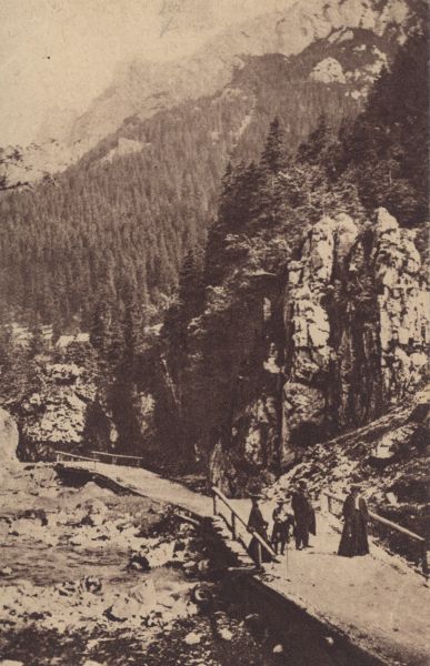 Turyści na wycieczce w Dolinie Kościeliskiej koło Pisanej Skały.