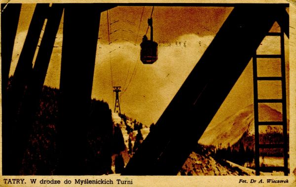 Na pocztówce znajduje się wagonik kolejki linowej widziany przez elementy podpory. Pod zdjęciem drukowany tytuł i nazwisko fotografa.