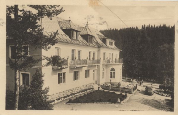 Związkowy dom wypoczynkowy Karpatia w Tatrzańskiej Leśnej i jego otoczenie. Przed budynkiem stoi samochód. W tle las.