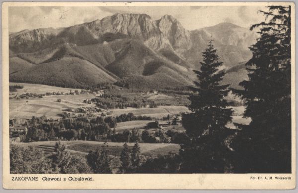 Widok na Zakopane z Gubałówki. W prawym dolnym rogu las. W części centralnej widać część Zakopanego. W tle tatrzański pejzaż. Widać Giewont, Sarnią Skałę, Małołączniak. Pod zdjęciem wpisany tytuł i nazwisko fotografa.