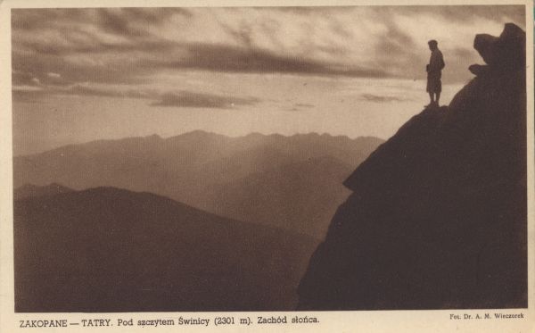 Po prawej stronie turysta stojący nad przepaścią. Po lewej pejzaż tatrzański o zachodzie słońca. Pod zdjęciem drukowany tytuł i nazwisko fotografa.