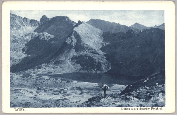 Na pierwszym planie turysta, na drugim planie Czarny Staw Polski. W tle pejzaż Tatr Wysokich. Pod zdjęciem drukowany tytuł.