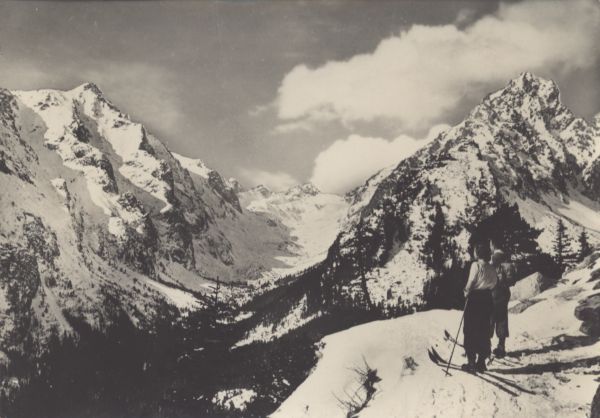 Widok z Magistrali Tatrzańskiej na Dolinę Staroleśną w scenerii zimowej. Na pierwszym planie narciarze. W tle Sławkowski Szczyt i Pośrednia Grań.