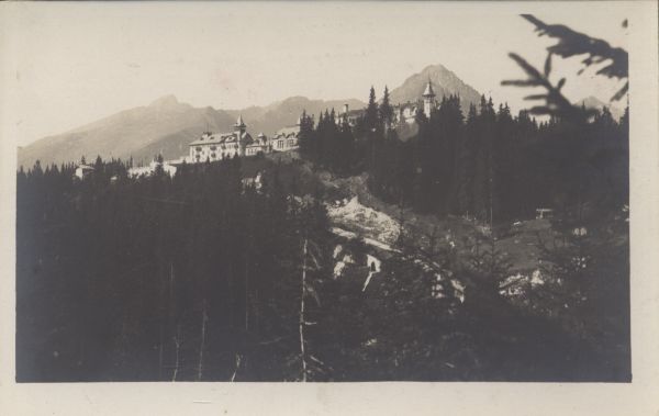 Hotele w Szczyrbskim Jeziorze. W dole widoczne tory kolei zębatej ze Szczyrby. W tle Krywań i Solisko.
