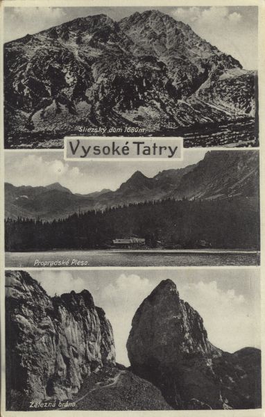 Pocztówka 3. elementowa: Schronisko Śląski Dom w Dolinie Wielickiej, w tle Gerlach. Schronisko nad Popradzkim Stawem, w tle Koprowy Wierch i Wołowiec Mięguszowiecki. Żelazne Wrota.