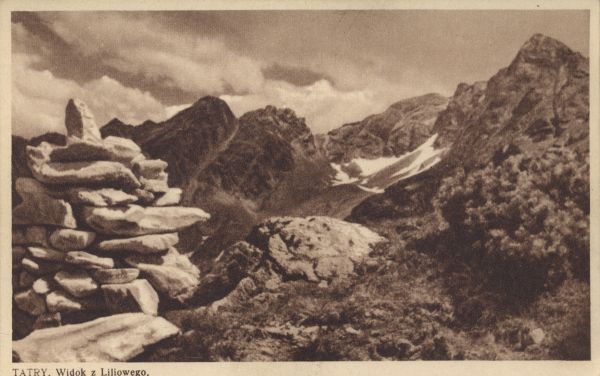 Widok z Liliowego. Z prawej w tle Świnica, z lewej Kościelec. Pod zdjęciem wydrukowany tytuł.