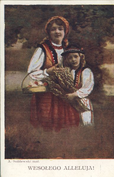 Reprodukcja obrazu A. Sobolewskiego. Dwie postacie Matki i syna w odświętnych góralskich strojach trzymają wiązankę bazi i koszyk ze święconką. Pod reprodukcją drukowany tytuł.