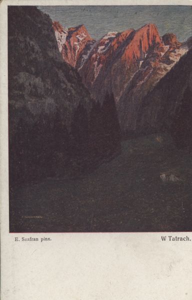 Reprodukcja obrazu E. Szafrana W Tatrach. Pejzaż tatrzański. Pod reprodukcją drukowany tytuł.