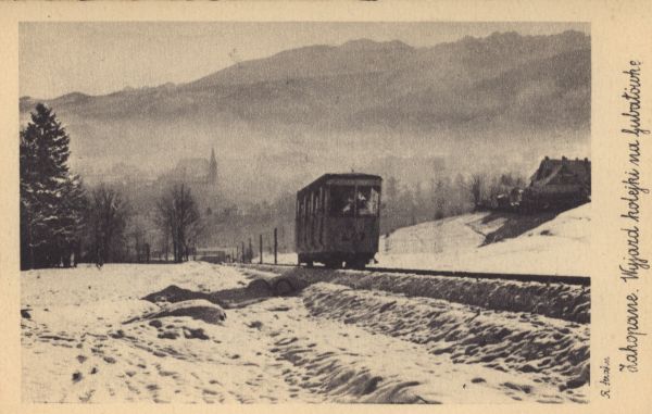 Wagony kolei linowo-terenowej na Gubałówkę w zimowej scenerii. W dole widok ogólny na Zakopane. Z prawej strony zdjęcia drukowany tytuł i nazwisko fotografa.