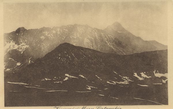 Widok z Walentkowego Wierchu do Doliny Wierchcichej. W tle Hruba Grań i Krywań. Pod zdjęciem drukowany tytuł.