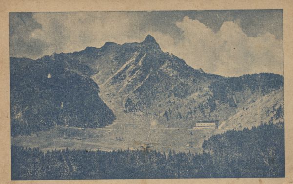 Szałasy i hotel górski na Polanie Kalatówki. W tle Giewont.