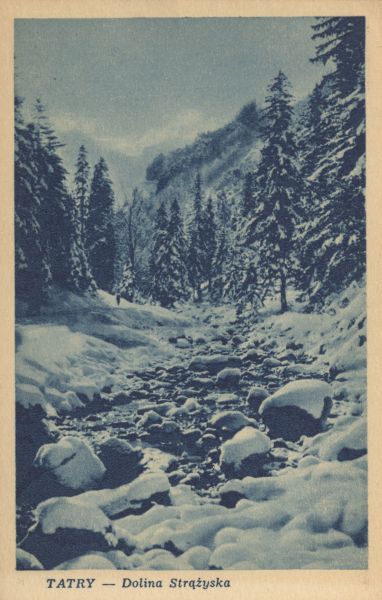 Strążyski Potok w Dolinie Strążyskiej zimą. W tle Kominy. Pod zdjęciem drukowany tytuł.