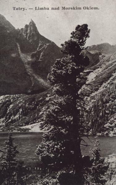 Limba (Pinus cembra L.) nad Morskim Okiem. W tle Mnich i Szpiglasowy Wierch. U góry drukowany tytuł.