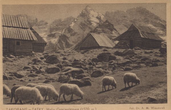 Owce wśród szałasów na Hali Gąsienicowej. W tle ośnieżony Kościelec. Pod zdjęciem drukowany tytuł i nazwisko fotografa.
