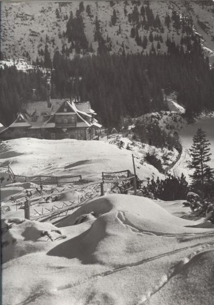 Widok na schronisko PTTK nad Morskim Okiem zimą.
