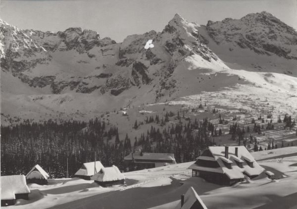Hala Gąsienicowa w zimowej scenerii. W dole widoczne szałasy i schronisko PTTK Murowaniec. W głębi Kozi Wierch, Kościelec i Świnica.