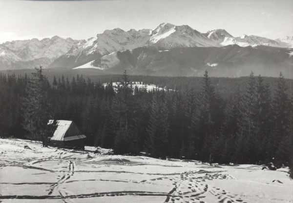 Polana Głodówka zimą. Na pierwszym planie szałas pasterski i las. W tle panorama Tatr.