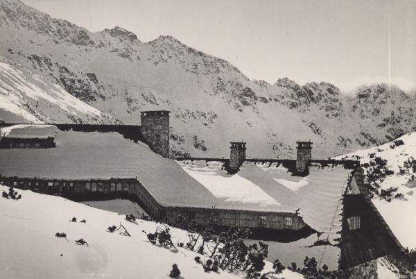 Schronisko PTTK w Dolinie Pięciu Stawów Polskich w zimowej scenerii. W tle Miedziane i Szpiglasowy Wierch.