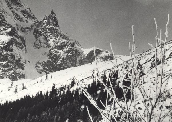 Mnich nad Morskim Okiem w Dolinie Rybiego Potoku w zimie.