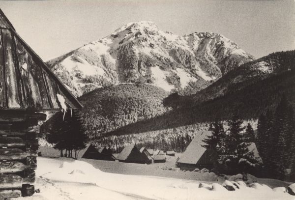 Szałasy na Polanie Chochołowskiej w zimie. W tle Kominiarski Wierch.