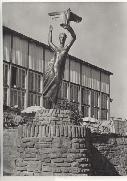 Rzeźba Polonia Restituta na Gubałówce. W tle restauracja.