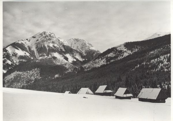 Polana Chochołowska zimą. Na polanie szałasy, w tle Kominiarski Wierch.