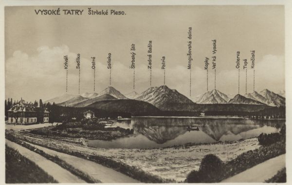 Szczyrbskie Jezioro. Z lewej nad brzegiem hotel Solisko i willa Marina. W tle podpisane szczyty. U góry tytuł.