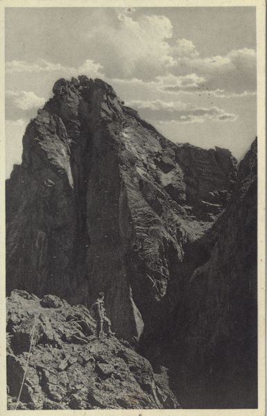 Staroleśny Szczyt. Na grani stoi taternik.