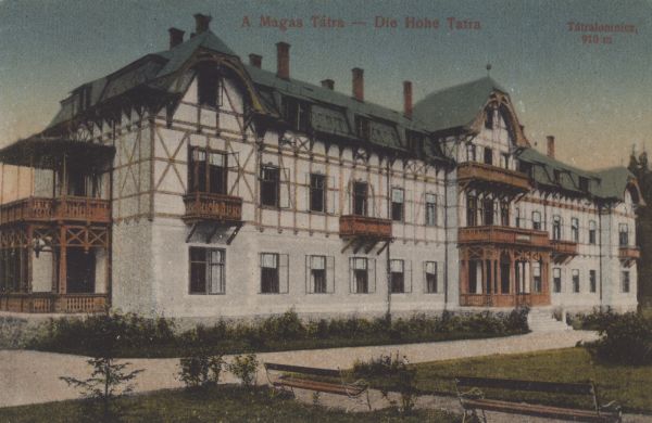 Widok na Dom Słowacki w Tatrzańskiej Łomnicy i jego otoczenie. U góry drukowany tytuł, również w języku niemieckim.