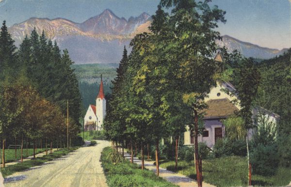 Tatrzańska Łomnica. Przy ulicy kościół ewangelicki, w tle Łomnica.