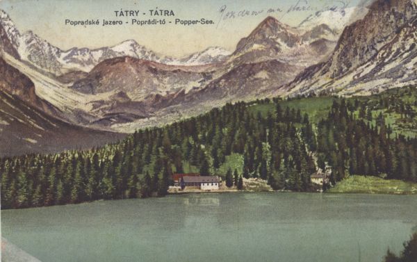 Popradzki Staw w Dolinie Mięguszowieckiej. Nad brzegiem widoczne schronisko. W tle Koprowy Wierch i Wołowiec Mięguszowiecki. U góry drukowany tytuł, również w języku węgierskim i niemieckim.