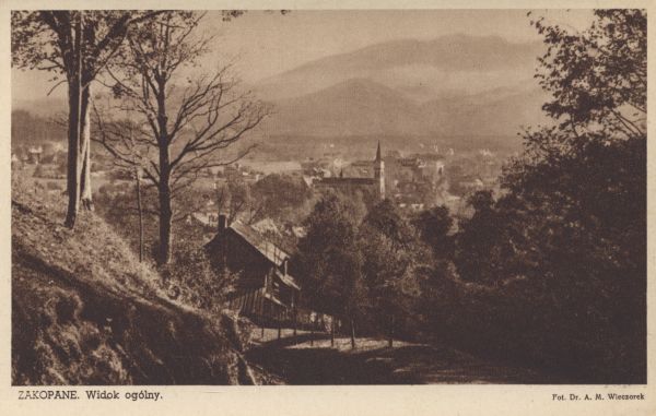 Widok ogólny na Zakopane ze zboczy Gubałówki. W środku kościół św. Rodziny. Pod zdjęciem drukowany tytuł: ZAKOPANE. Widok ogólny. Fot. Dr. A. M. Wieczorek.