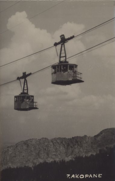 Wagoniki kolei linowej na Kasprowy Wierch podczas mijania. W dole Zawracik Kasprowy. Na dole wpisany tytuł.