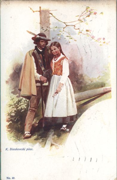 Reprodukcja obrazu Kazimierza Bieńkowskiego przedstawiającego dwoje młodych górali. Pod reprodukcją drukowane nazwisko autora.
