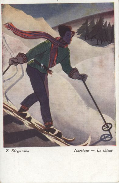 Reprodukcja obrazu Zofii Stryjeńskiej pt. Narciarz. Pod reprodukcją wydrukowany tytuł.