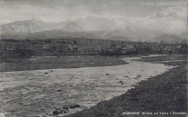Poronin. Na pierwszym planie rzeka Biały Dunajec, w tle panorama Tatr. Na dole tytuł.
