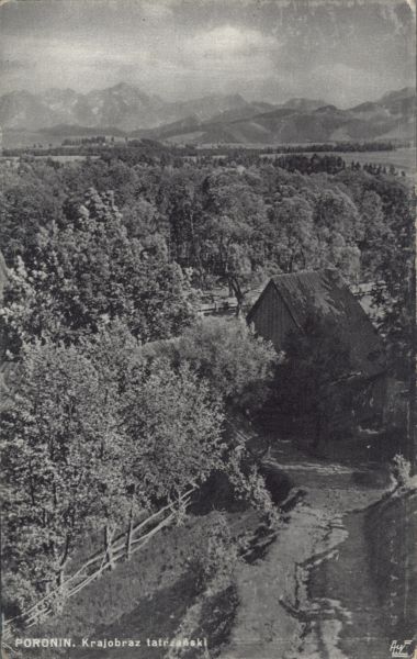 Zabudowania wiejskie w Poroninie. W tle panorama Tatr. Na dole tytuł i monogram wiazany fotografa.