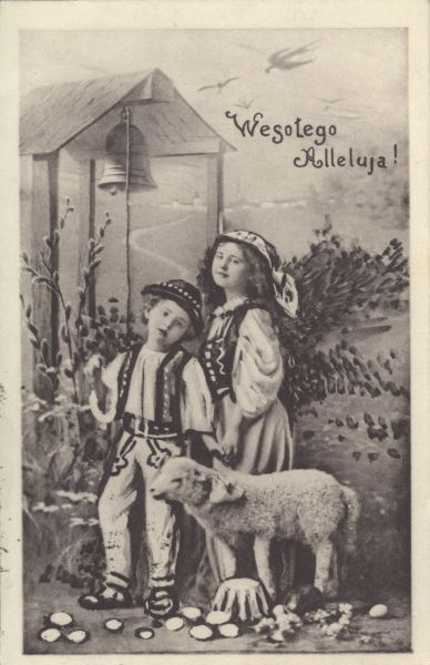 Pocztówka okolicznościowa z okazji Wielkiej Nocy. Napis: Wesołego Alleluja!