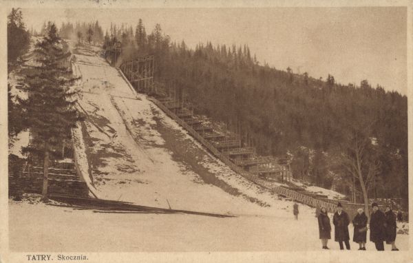Turyści pod Wielką Krokwią w Zakopanem zimą. Pod zdjęciem drukowany tytuł.