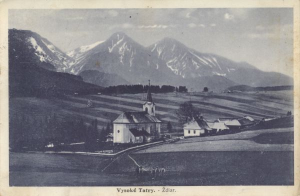 Kościół i zabudowania wiejskie w Zdziarze. W tle Płaczliwa Skała i Hawrań.
