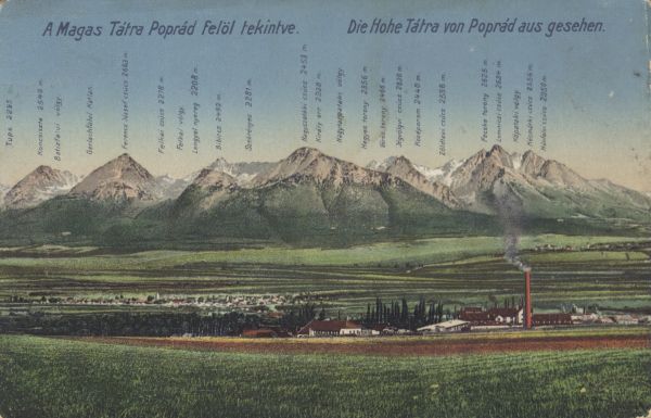 Panorama Tatr Wysokich znad Popradu. U góry drukowany tytuł, również w języku niemieckim oraz nazwy szczytów i ich wysokości.