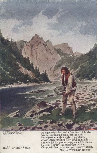 Walery Eliasz Radzikowski. Baśń Tatrzańska. By do walki z wężem wyrobić swe siły Dźwiga więc Perłowicz kamienie i bryły. Ażeby zawładnąć ciała muskułami. Do zapasów staje ciągle z góralami. Znów kiedy próbuje siły swej ramienia. Drzewa jakby piórka wyrywa z korzenia. I czasu i pracy tak poświęca wiele. Chcąc wkrótce pokonać gór nieprzyjaciela. Maryla Westfalewiczówna.