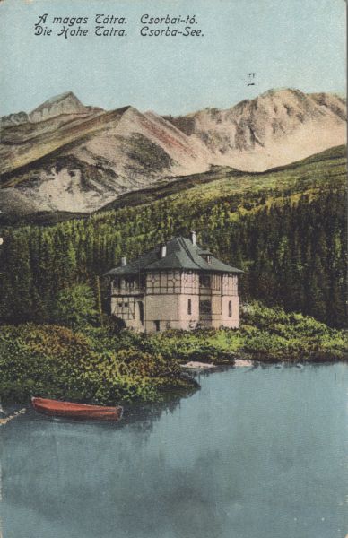 Willa Marina nad Szczyrbskim Jeziorem. W tle z lewej Krywań. U góry drukowany tytuł, również w języku niemieckim.
