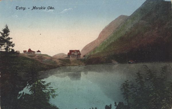 Schronisko nad Morskim Okiem w Dolinie Rybiego Potoku. U góry wydrukowany tytuł.