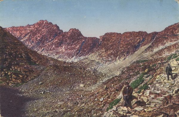 Widok na Polski Grzebień z Doliny Wielickiej. Na szlaku widoczni turyści. W tle z lewej Wielicki Szczyt.