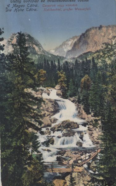 Wielki Wodospad Zimnej Wody w Dolinie Zimnej Wody. U góry wydrukowany tytuł, również w języku węgierskim i niemieckim.