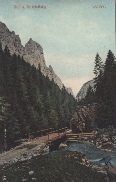 Raptawicka Turnia w Dolinie Kościeliskiej. Dołem płynie Kościeliski Potok. U góry wydrukowany tytuł.