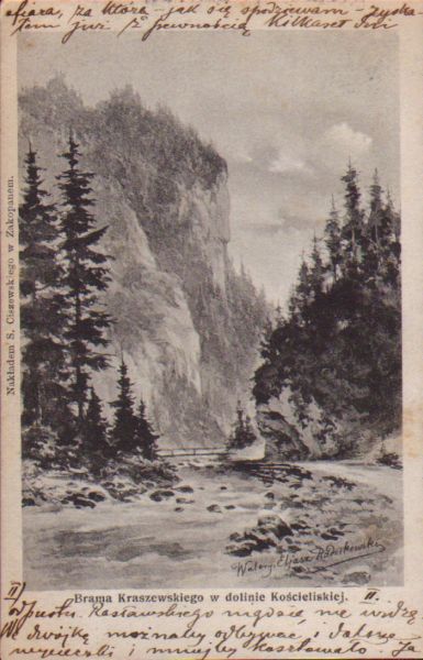 Reprodukcja grafiki Walerego Eljasza - Radzikowskiego pt. Brama Kraszewskiego w Dolinie Kościeliskiej. Pod zdjęciem wydrukowany tytuł, na marginesie po lewej stronie nakładca. Na marginesach korespondencja.